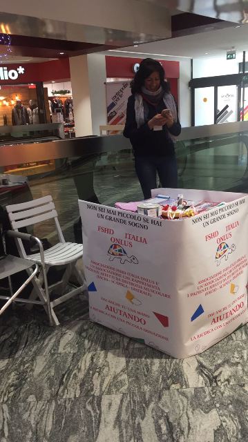 Il giorno 1 Dicembre 2016 la nostra associata Emma ha allestito, presso il Centro Commerciale METROPOLIS di Rende (CS), una postazione nella quale è stato esposto materiale informativo di FSHD Italia Onlus allo scopo di raccogliere fondi sensibilizzando gli avventori sull’importanza della ricerca. La nostra Associazione ha poi destinato tutto il ricavato ad un progetto di ricerca sulla distrofia Facio-Scapolo-Omerale. Il nostro grazie ad Emma.